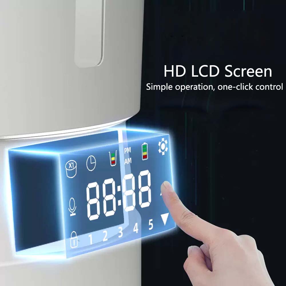 Он Автоматическая кормушка для домашних животных Предлагает надежное кормление по расписанию с 1-4 приемами пищи и настраиваемыми порциями до 40. Обладая объемом 4 л, двумя вариантами питания (проводное или от батареи), 10-секундным голосовым диктофоном для записи сигналов о кормлении и интуитивно понятным ЖК-экраном, он гарантирует, что ваш питомец будет сыт и доволен в любое время.