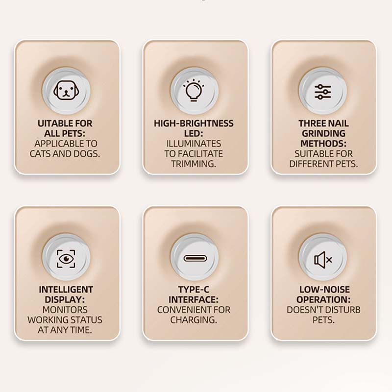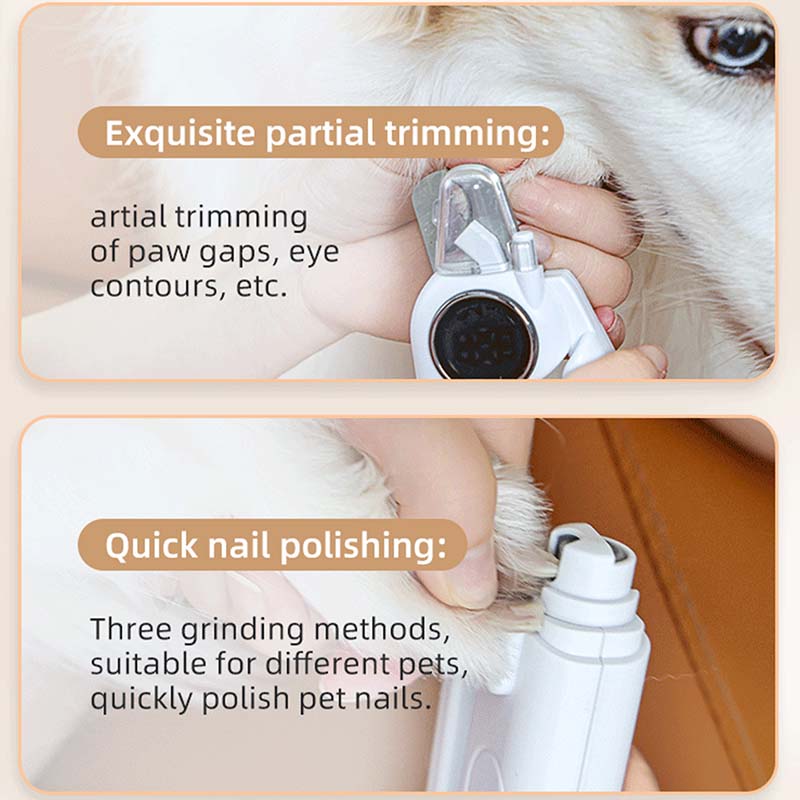 1. Встроенная светодиодная подсветка Встроенная светодиодная подсветка обеспечивает хорошую видимость во время груминга, предотвращая стрижку вслепую и защищая шерсть вашего питомца от травм. 2. Интеллектуальный мониторинг дисплея Интеллектуальный дисплей в режиме реального времени отслеживает рабочее состояние, включая уровень заряда батареи и режим работы, позволяя с первого взгляда оценить состояние устройства. 3. Функция профессиональной шлифовки: Высокоэффективная шлифовальная головка плавно полирует острые края когтей, обеспечивая бережную полировку, как в салоне, для собак и кошек всех размеров. 4. Удобная зарядка через Type-C: Универсальный интерфейс Type-C обеспечивает быструю и удобную зарядку в любое время и в любом месте, избавляя от необходимости замены батареи.